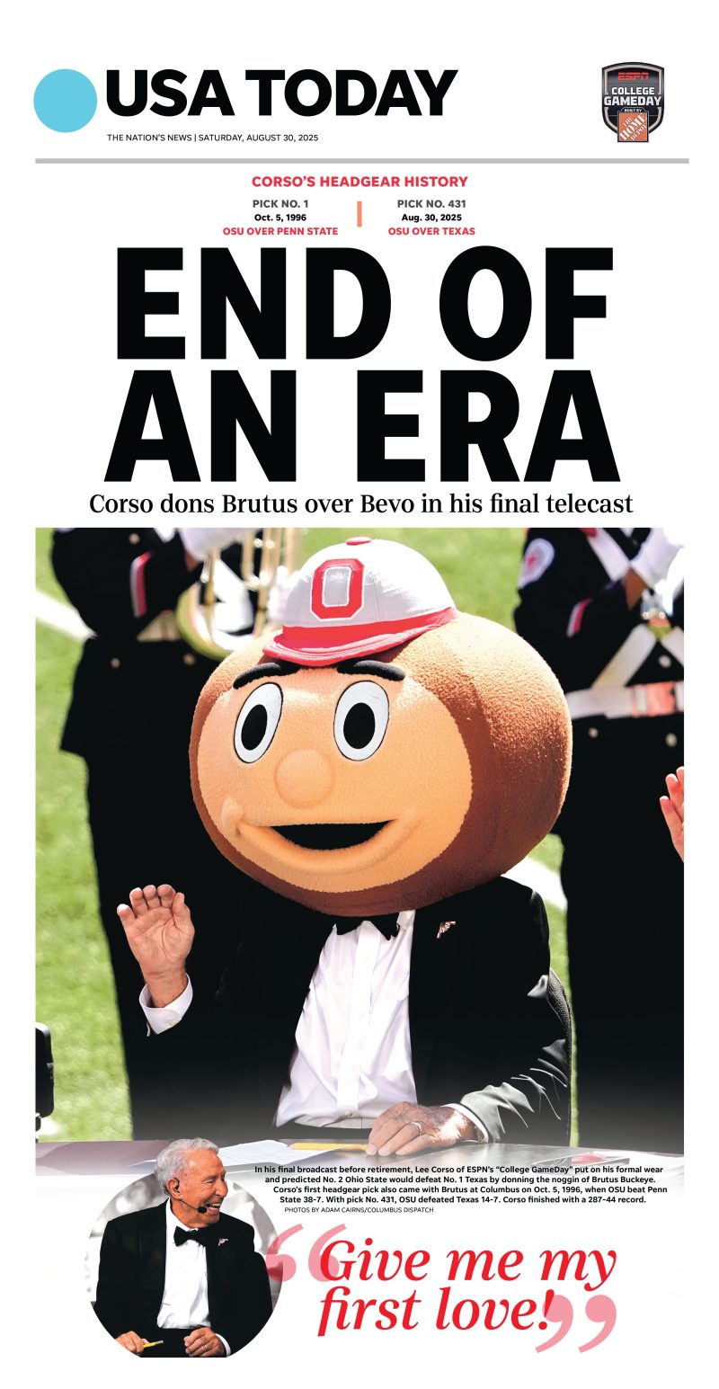 The full-page print highlights Corso’s final broadcast with ESPN’s “College GameDay.” From Ohio Stadium, where he made his first headgear prediction on Oct. 5, 1996, by donning Brutus Buckeye’s noggin, Corso chose Ohio State’s Brutus over Texas’ Bevo for his 431st and final prediction on Aug. 30, 2025. He told a packed house at the Horseshoe: ‘Give me my first love!’ Then he donned Brutus and waved as the crowd went wild. The Best Damn Band in the Land spelled out C-O-R-S-O.